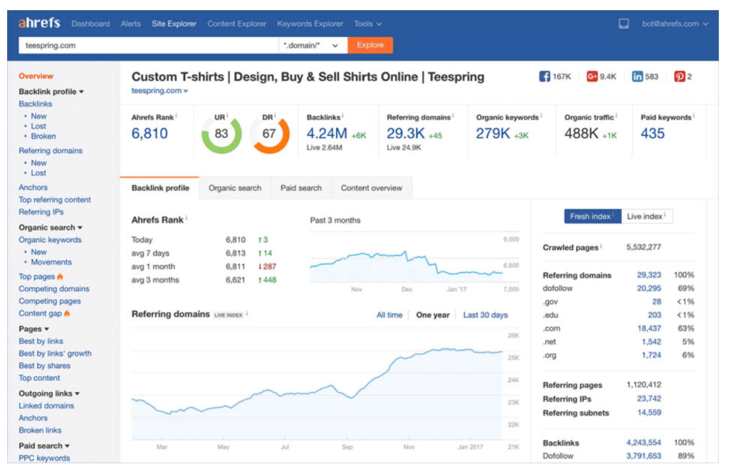 Ahrefs vous permet d’examiner les données de sites concurrentiels telles que les liens de retour, les domaines de référence, les mots-clés organiques ou payants, et bien plus encore. Il vous indique quelles pages sont en haut, vous montre le classement de la page que vous analysez et quel contenu en ressort. Les seules données sociales fournies sont le contenu populaire de Facebook, Twitter, Google, LinkedIn et Pinterest. C’est un excellent outil à intégrer avec des outils d’analyse plus robustes.