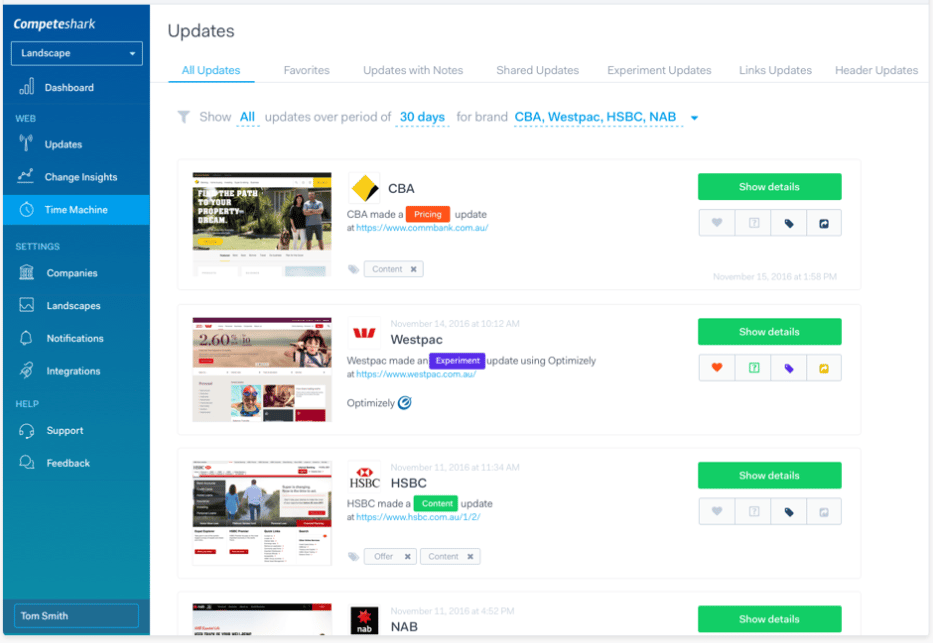 Analysez les tendances en temps réel ou au fil du temps pour voir les changements apportés par vos concurrents, tels que la conception, les mises à jour de produits, les prix, le contenu, le référencement, etc. Examinez plusieurs marques à la fois pour connaître les tendances. Soyez alerté par des e-mails quotidiens, que vous pouvez facilement distribuer à votre équipe.