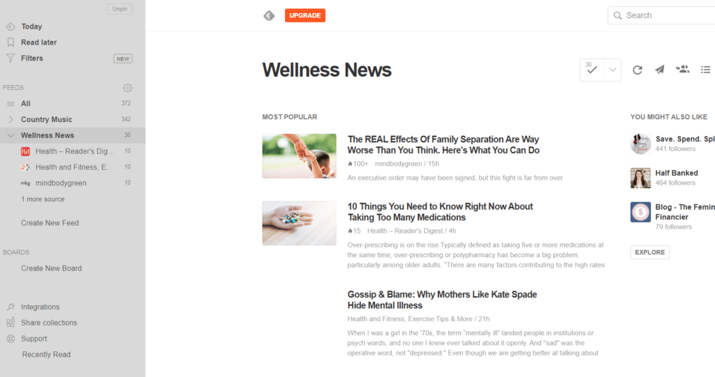 Feedly apporte du contenu pertinent à un endroit où vous pouvez l’organiser par thème. Suivez les actualités de l’industrie et découvrez quel contenu est le plus populaire dans n’importe quelle catégorie. Ceci est particulièrement utile si vous publiez des blogs ou d’autres publications et que vous souhaitez vous comparer à d’autres dans votre secteur d’activité. Utilisez vos threads pour créer des tableaux, puis profitez des intégrations dans des applications telles que Slack, Trello et IFTTT pour les partager avec les différentes équipes de la marque, telles que le marketing, les ventes et la gestion.
