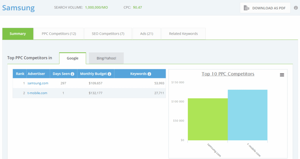 iSPIONage vous montre les meilleurs concurrents en PPC et SEO pour n’importe quelle marque que vous recherchez. En outre, vous pouvez voir quelles annonces sont diffusées et où elles sont diffusées, sans parler des mots-clés associés, triées par score de pertinence. Allez plus loin avec Campaign Watch, qui permet de comparer côte à côte les pages de destination, de surveiller les tests A/B, et bien plus encore.