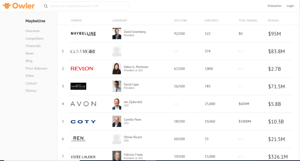 Owler fournit une vue macro des marques en les comparant à leurs concurrents sur plusieurs aspects. Obtenez des informations globales telles que le nombre d’employés et de revenus, le score SEO, le nombre d’abonnés aux médias sociaux, l’historique du site Web, les vidéos et plus encore. En se reposant sur le crowd-sourcing, l’intelligence artificielle et l’apprentissage automatique, Owler propose une large gamme d’informations internes et externes de l’entreprise en suivant le contenu des actualités et des médias, en plus de toutes les sources mentionnées ci-dessus