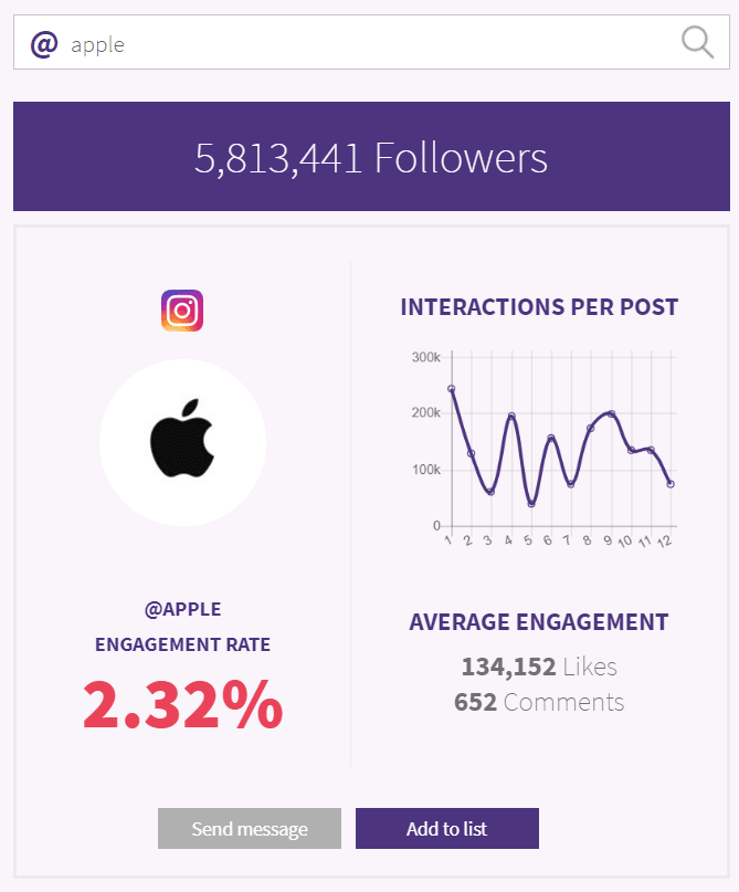 Phlanx vous permet de visualiser les taux d’engagement des comptes Instagram, en indiquant le nombre moyen de j’aime et de commentaires par message. Cette information est très utile pour comparer les marques de votre catégorie et voir à quel point les gens interagissent avec eux. L’inconvénient est que vous n’avez pas de données sur le sentiment dans ces interactions. Cependant, la capacité de trouver rapidement des influenceurs et d’entrer en contact avec des collaborateurs potentiels du est un vrai plus.