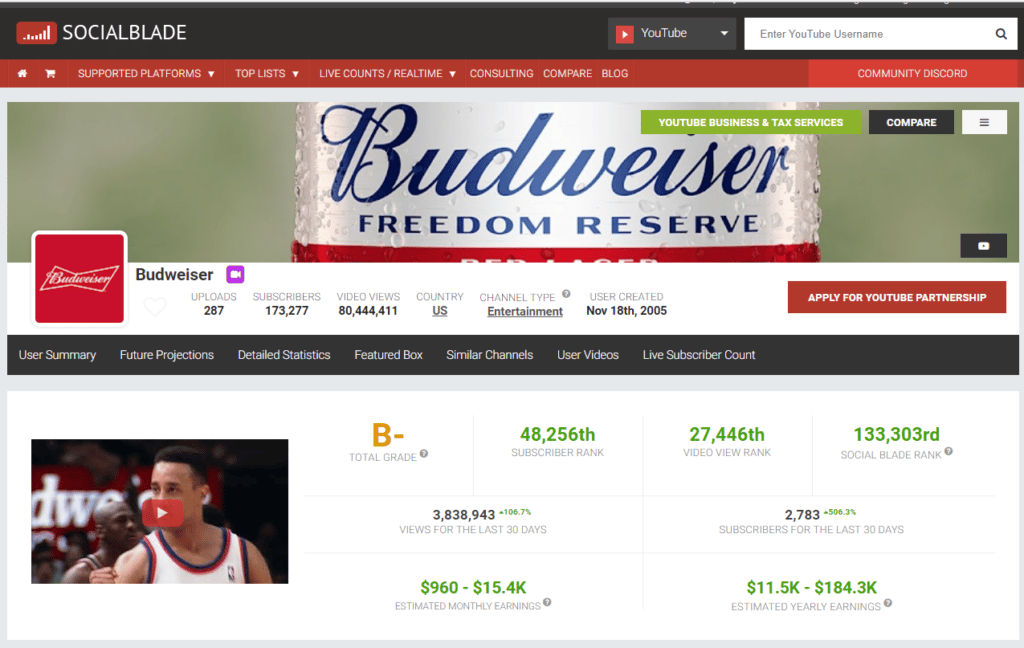 Social Blade utilise les statistiques sociales de YouTube, Instagram, Twitch, Dailymotion, Mixer et Twitter pour classer les marques par engagement. Vous pouvez obtenir un instantané de toutes les plates-formes, puis cliquer pour obtenir des résultats plus détaillés pour chaque plate-forme. Si la vidéo est un élément important de votre stratégie sociale, le mélange de canaux est plein d’informations. Mais vous ne saurez pas pourquoi vous avez — ou n’avez pas — des vues. Cependant, vous verrez des canaux similaires aux vôtres, ce qui est très utile.